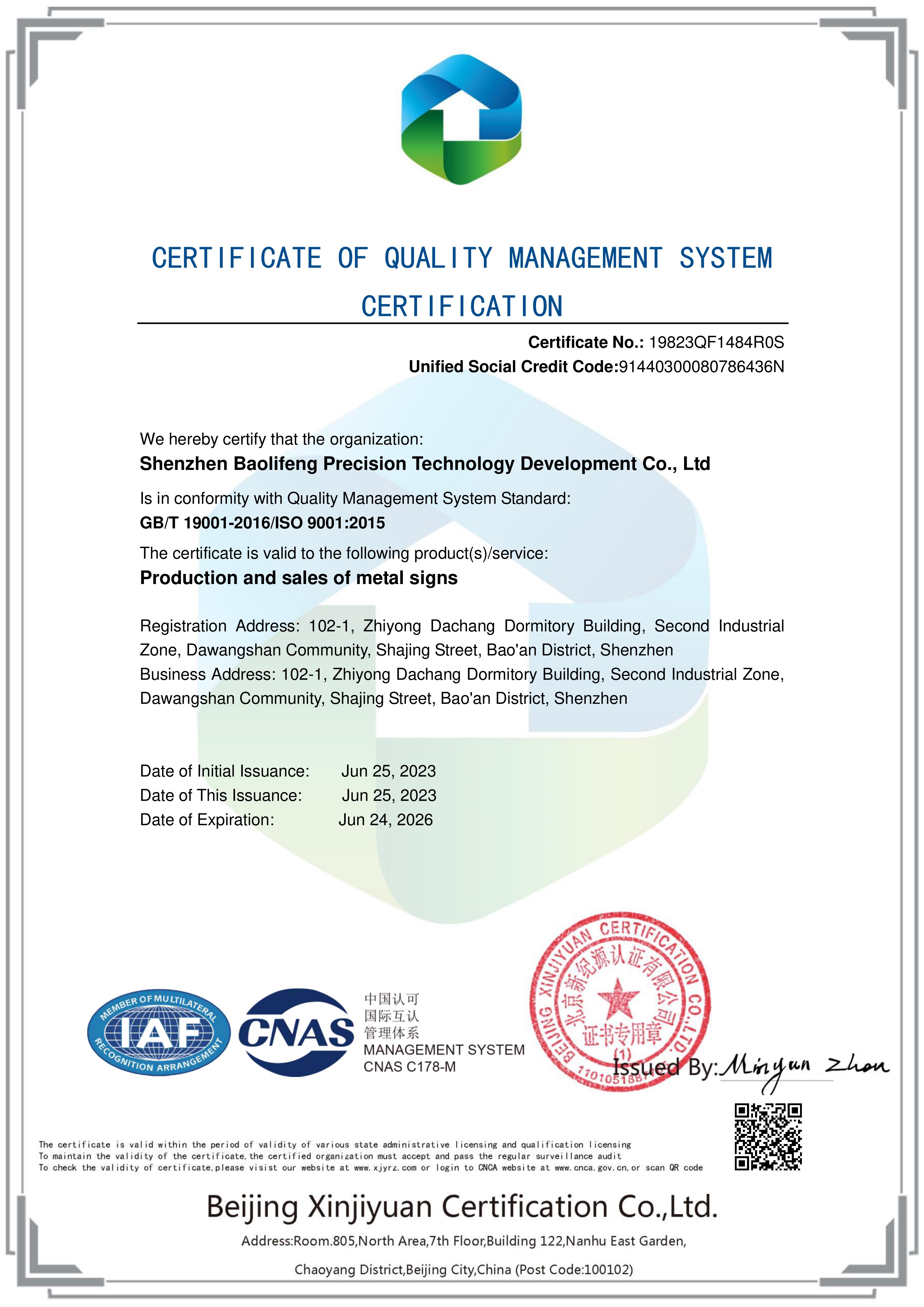 公司獲得金屬標牌生產(chǎn)質(zhì)量管理體系認證證書