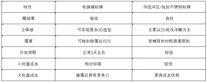 電鑄可以生產出壁厚均勻且極?。?.04mm起) 的標牌,既節省材料、減輕重量,又因為鎳本身的高強度而保持足夠的結構剛性。
